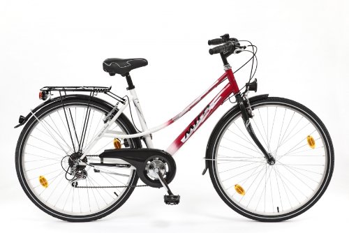 Ein Damen-Trekkingbike mit innovativer Rahmenform! Das Damenrad ist nicht nur auf asphaltierter Straße, sondern auch für leichtes Gelände tauglich. Die 7-Gang Kettenschaltung mit Schaltwerkschutz und Drehgriff funktioniert leicht und präzise. Die komplette STVZO-Ausstattung entspricht dem gesetzlich geforderten Standart. Für zusätzlichen Komfort sorgt der Gepäckträger, der Kettenschutz und der ergonomisch geformte Damengelsattel.